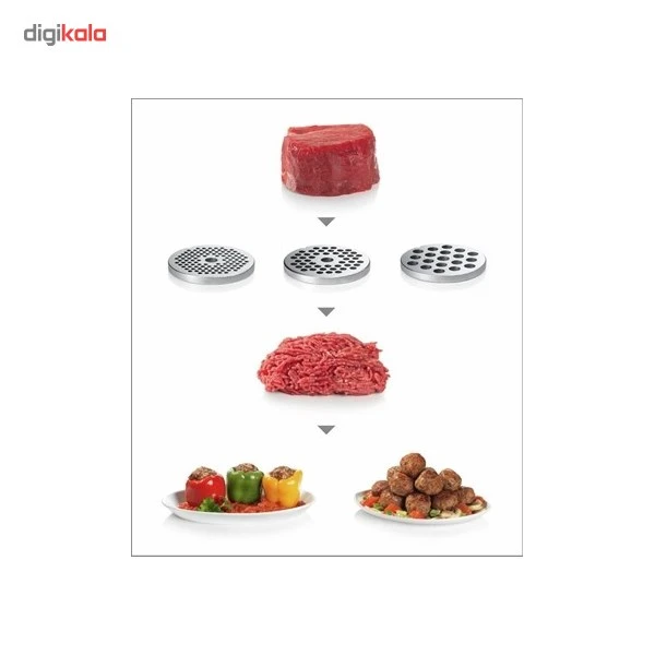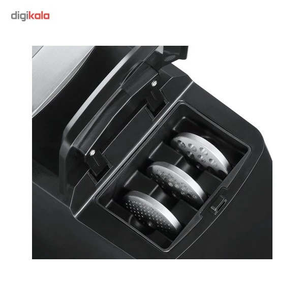 چرخ گوشت بوش مدل MFW68660 دستگاهی قدرتمند است که طراحی هوشمندانهای در پسزمینه دارد. این چرخگوشت توان بالایی داشته و میتواند مقدار زیادی گوشت را چرخ کرده و تحویل دهد. این قابلیت به خاطر بهرهگیری از تیغهی برنده از جنس فولاد ضدزنگ است که جلوی مارپیچ دستگاه نصب میشود. دیسکهای خروجی این دستگاه در سایزهای مختلف، باعث میشوند گوشت یا مادهی غذایی چرخ شده در اندازههای مختلفی بسته به نیاز مصرفکننده آماده شود. وجود قیفهای مخصوص تهیهی سوسیس هم میتواند امکانی کاربردی باشد تا تنوع غذایی افراد بالا برود. چرخگوشت بوش مدل MFW68660 طول سیم برقی به میزان مناسب دارد تا چندان محدودیتی برای فاصله از پریز برق وجود نداشته باشد. سینی قرارگیری مواد غذایی در بالای دستگاه فلزی است که باعث استحکام و ظرفیت تحمل وزن بیشتر و در نتیجه راحتی کارکردن با آن میشود. روشن و خاموش شدن توسط یک دکمه در سمت جانبی دستگاه انجام میشود. درصورتیکه رگ و پی یا قطعات بزرگ گوشت دور مارپیچ یا تیغه دستگاه گیر کنند میتوان از عملکرد چرخش معکوس دستگاه بهره برد. بهاینترتیب همه قطعات برعکس چرخیده و انسداد رفع میشود. برای حمل راحتتر بدنه چرخگوشت یک دسته در بالای آن در نظر گرفته شده است. صفحات فلزی خروجی در پشت دستگاه در جایگاه مخصوص نگهداری میشوند تا از گمشدن آنها جلوگیری شود. این مدل دارای قطعات مخصوص رنده کردن و سوسیس ساز و همچنین آبگیری برخی میوه ها را دارد. بوش تولیدکننده و عرضهکنندهی لوازمخانگی برقی در سراسر جهان است که با ارائهی محصولات باکیفیت و مبتکرانه، طرفداران زیادی در سراسر جهان دارد.